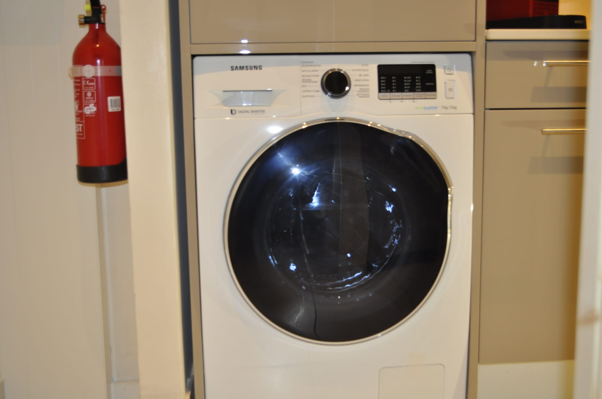 Extincteur, lave et séché linge.